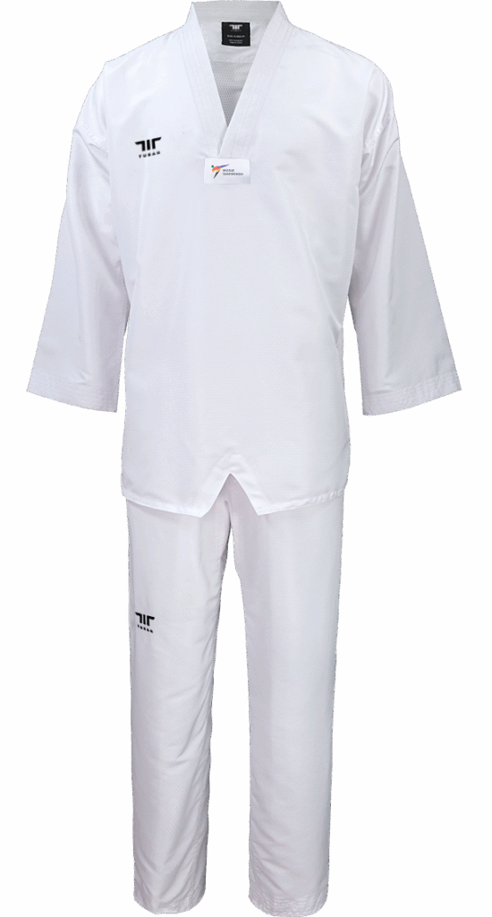 Pour l’élève débutant, seule la tenue d’entraînement (dobok) est requise.